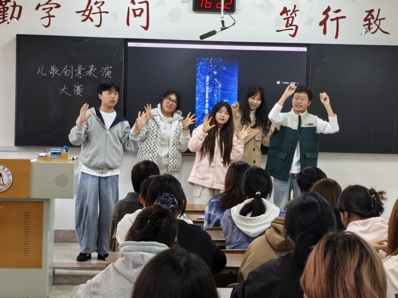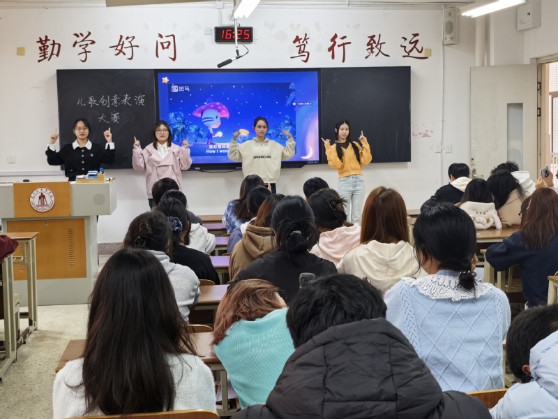 近日,外语与商务学院(国际教育学院)在大同楼C401举办“锻造学科素养,孵化创新实践”英文儿歌创意表演大赛。赛事面向小学英语教育专业全体师范生,以团队形式进行,共吸引24支队伍、近60名学生参赛,生动展现了未来小学英语教师应具备的多元综合素养。