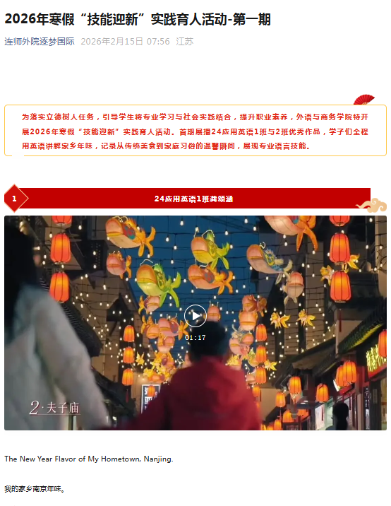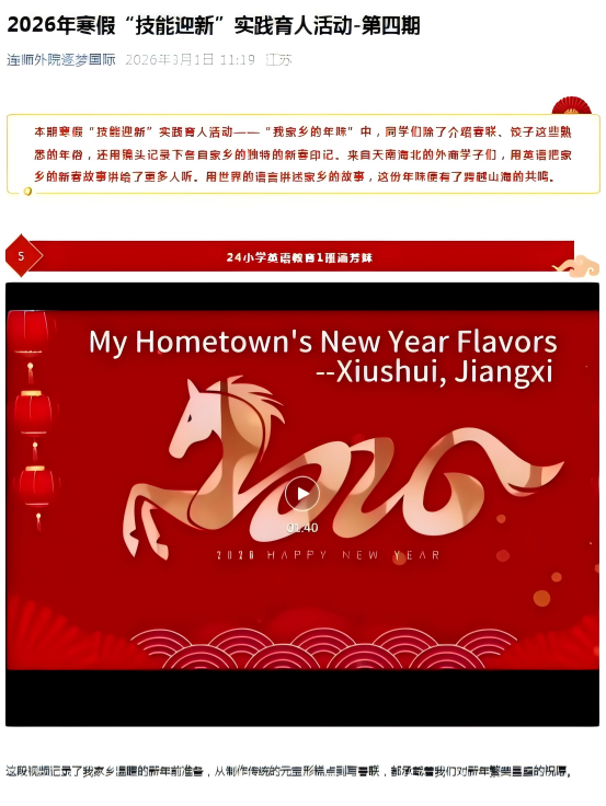 外语与商务学院精心策划并组织了2026年寒假“技能迎新”实践育人活动。本次活动以“技能迎新,知行合一”为主题,引导全院学生利用假期,结合专业特长服务家乡、提升技能,取得丰硕育人成果。